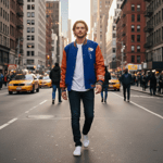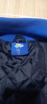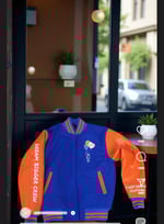 royal blue and orange varsity jacket, featuring 24 ounce royal blue wool body with orange cowhide leather sleeves.